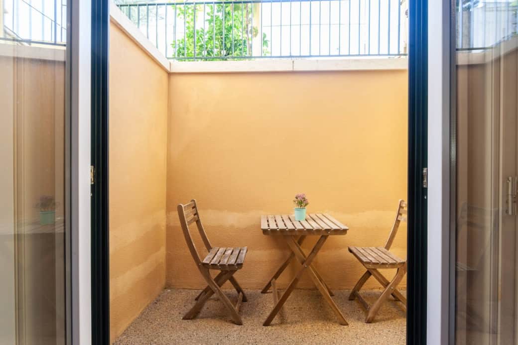 Double door window opens to a small private patio